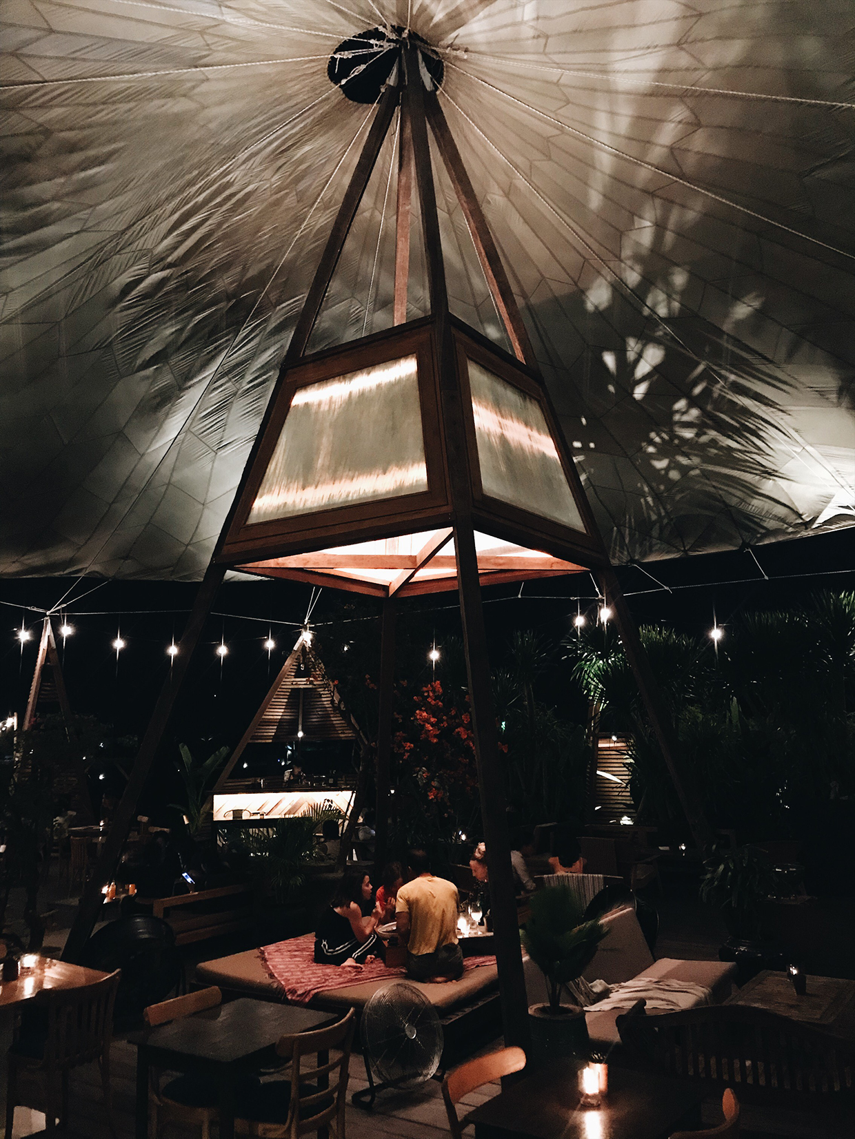 緑に囲まれた大きなパラシュートの下で