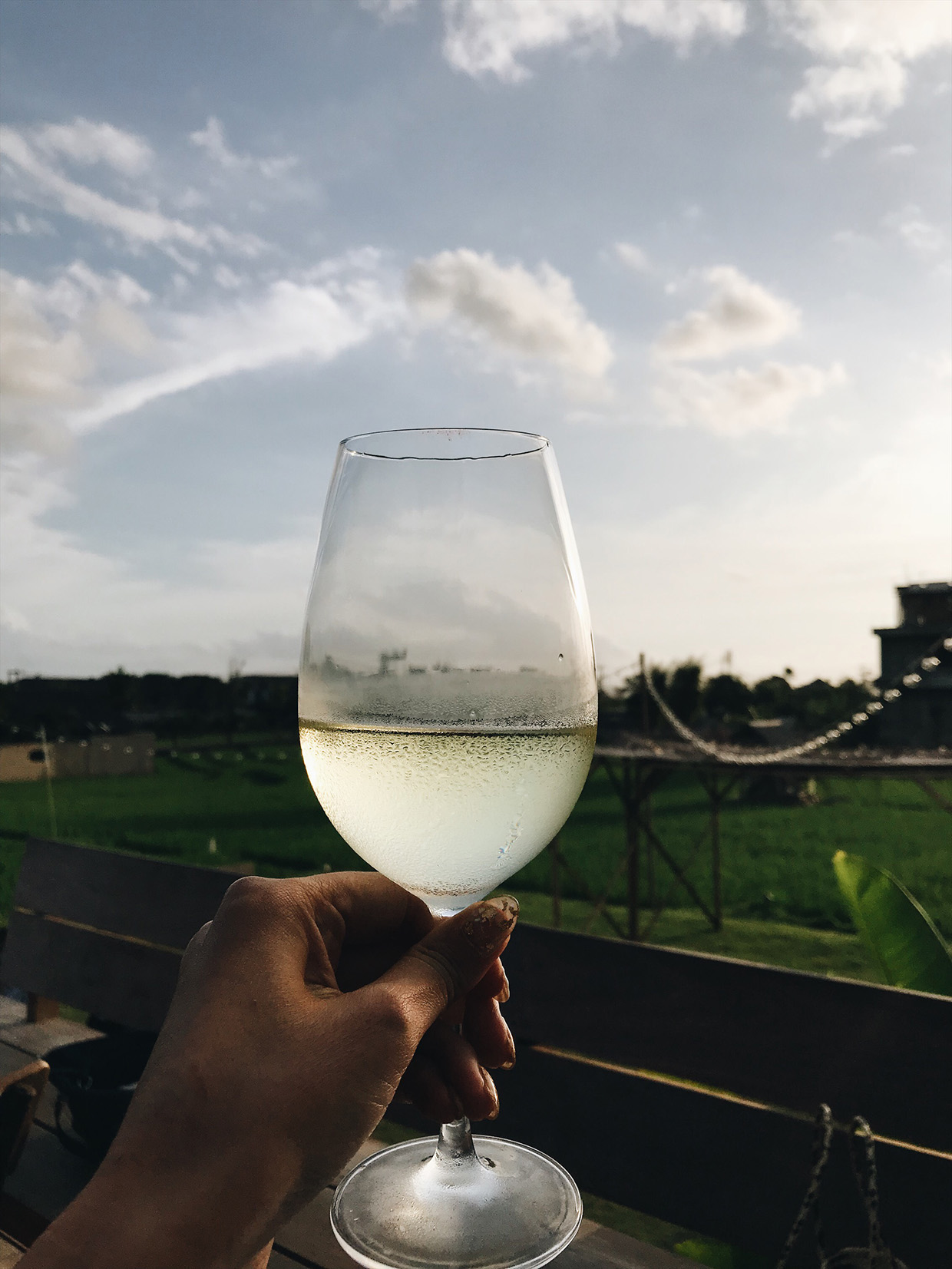 ワインは赤が好きなライターですが開放感ある雰囲気からか、はたまた田んぼビューだからか、この日は迷わず白ワインをオーダーしました。写真前に待ちきれず飲んでしまい、リップの跡が淵についててすみません(笑)